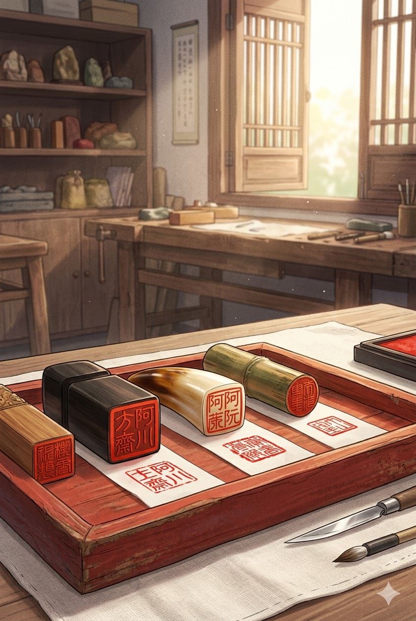 下一塊,是阿阮的印。用的是溫潤的水牛角。老陳換了一把細刀,字體刻得柔韌、細膩,但在印面的邊緣,他刻意留下了一道厚實的邊框,象徵著這個異鄉女子保護女兒的堅強防護罩。